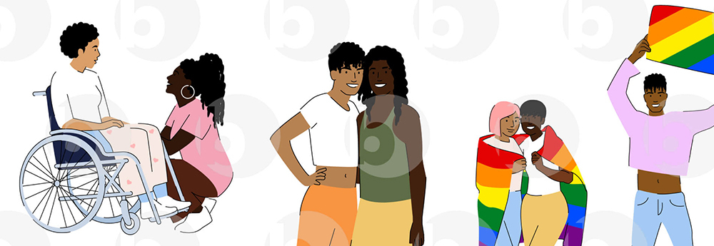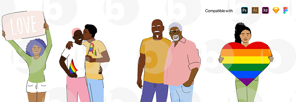 Gay pride or LGBT pride is the promotion of the self-affirmation, dignity, equality, and increased visibility of lesbian, gay, bisexual, and transgender people as a social group. Pride, as opposed to shame and social stigma, is the predominant outlook that bolsters most LGBT rights movements. We created illustrations to promote your pride in digital projects!