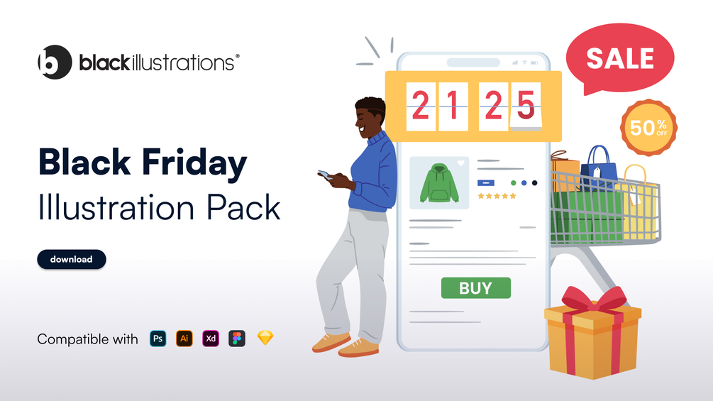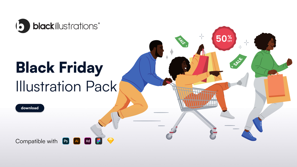 Upgrade your Black Friday campaigns with our Black Friday Illustration Pack, crafted exclusively to celebrate and showcase Black individuals in the digital space.